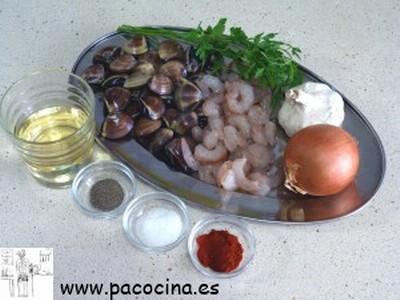 Ponemos las almejas en agua con sal durante 20 minutos luego las sacamos del agua con mucho cuidado para dejar en el agua la arena y tener las almejas limpias. En una sartén amplia ponemos dos cucharadas de aceite y pochamos la cebolla y el ajo finamente picados, salpimentamos ligeramente para que suden más y una vez tiernas ponemos el pimentón, la cayena y damos unas vueltas y rápidamente las almejas ya limpias, para evitar que se queme el pimentón, y también el vino.