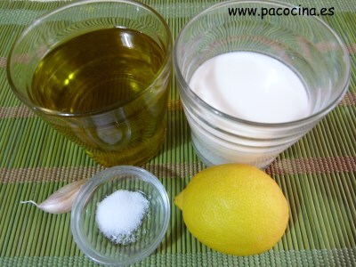 En un vaso de batidora se pone el diente de ajo, la sal la leche y aproximadamente la mitad del aceite. Comenzamos a batir y vamos incorporando el aceite restante. Se hace igual que la mayonesa pero generalmente se tarda un poco más, pero tiene la ventaja que no se estropea tan facilmente y se puede calentar. Mira el video para más detalles.