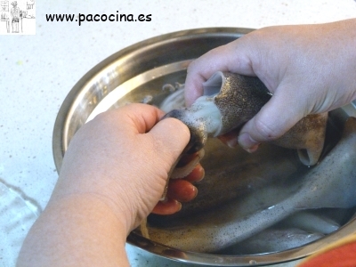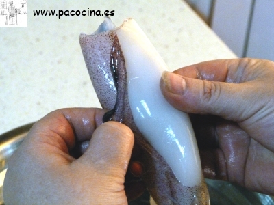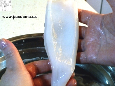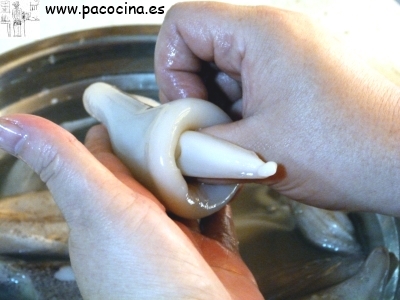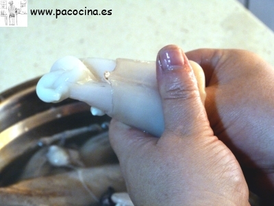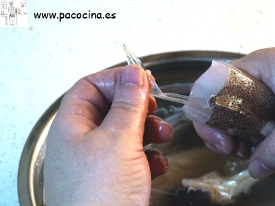 Sacamos y desechamos el contenido del interior de la bolsa enjuagando bien, que es su parte digestiva. Por un lado de la bolsa tiene un cartílago trasparente que sale fácilmente tirando de él, y lo desechamos también.