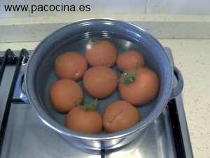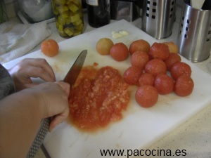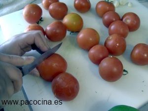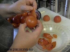 Lavamos los tomates y les practicamos un corte en forma de cruz. En un cazo tenemos agua hirviendo y metemos los tomates unos 30 segundos, esto se llama escaldar. Lo que conseguimos con esto es que se pelen bien los tomates y aprovechamos toda su carne. Así pues pelamos los tomates, y los picamos finamente, yo he usado tomate en rama que apenas tienen pepitas, por lo que no se las he quitado. Si se usa otra variedad de tomates que tengan más semillas pues se les quitan si se quiere, a mi personalmente me gusta que las tenga.