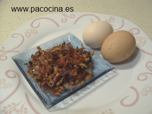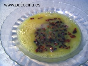 Picamos el chorizo en trozos no muy grandes. En un plato hondo, cascamos los huevos y los batimos, añadiendo la sal (cuidado el chorizo ya lleva); y le añadimos el chorizo picado.