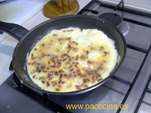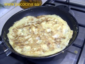 Si la hacemos redonda, cuando esté cuajada por el lado que la hemos hechado, nos ayudamos de un utensilio que sirve para darle la vuelta a las tortillas, es una especie de tapadera generalmente de plástico que tiene un agarre por una parte para sujetarla mientras la giramos y dejamos la tortilla de nuevo en la satén, pero por el otro lado, para que termine de hacerse. Lo explico de otra manera para que no haya duda. Colocamos la tapadera encima de la sartén y le damos la vuelta rapidamente al conjunto. Separamos la sartén, y colocandola de nuevo boca arriba, dejamos deslizar la tortilla por el borde de la tapadera en la sartén.